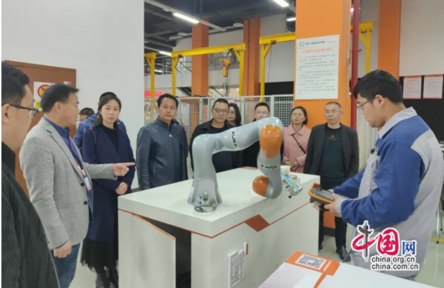 在职业中学,李平一行在学校副校长余代雄等人的陪同下参观了中德(成都)AHK职教培训中心以及KUKA机器人实训基地的装配、焊接、雕刻、码垛等教学站,听取了职业中学关于学校发展历程、办学模式、取得成效、未来规划等方面的详细介绍,尤其对政校企共育工匠人才的培养模式进行了深入的交流探讨。