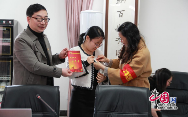 党支部书记何进代表支部为孙悦颁发党员政治生日卡,副书记温世红为孙悦佩戴党徽,并表示一枚党徽,一份责任,希望孙悦不断加强学习,努力工作,充分发挥共产党员的模范带头作用。