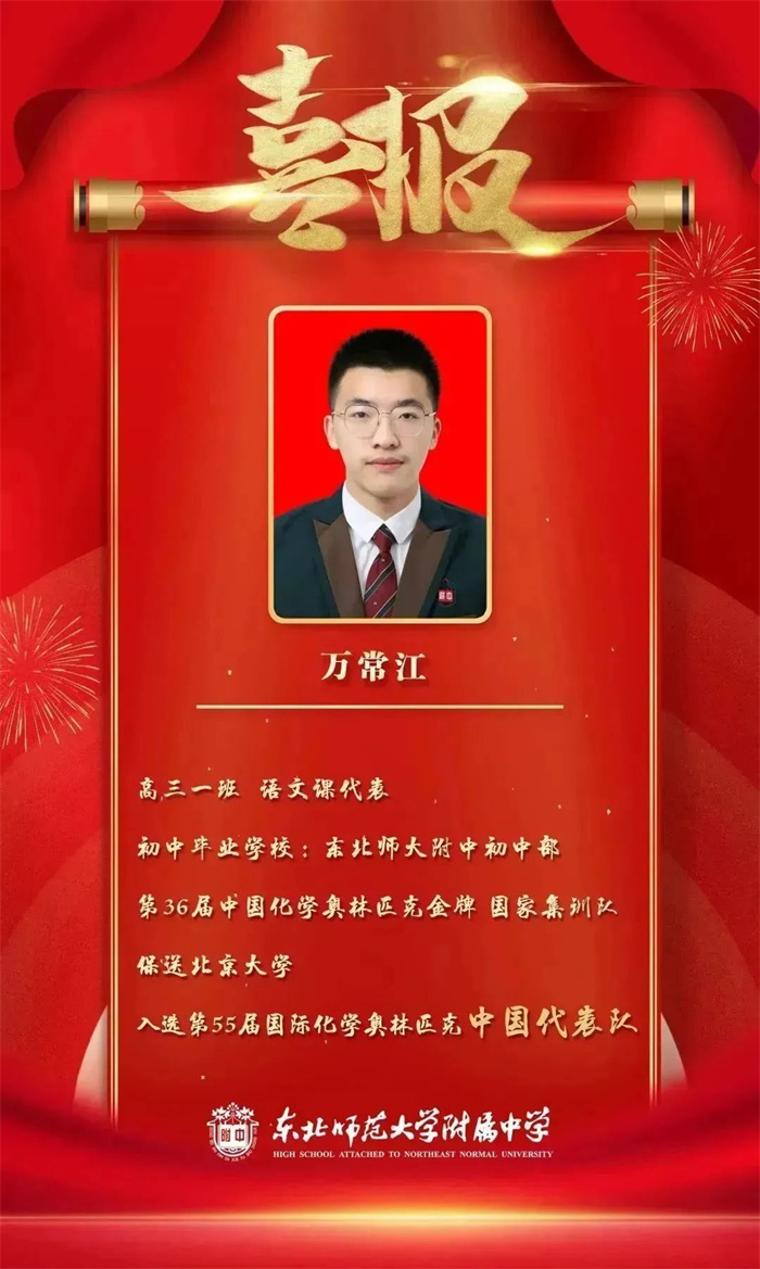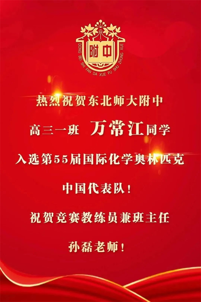 学校向万常江同学表示祝贺,希望他能再接再厉,再创佳绩,为国争光!祝贺并感谢他的竞赛教练员兼班主任孙磊老师!感谢他们的家人、化学教练员团队、化学教研室的全体老师、所有科任老师及初中老师的支持。