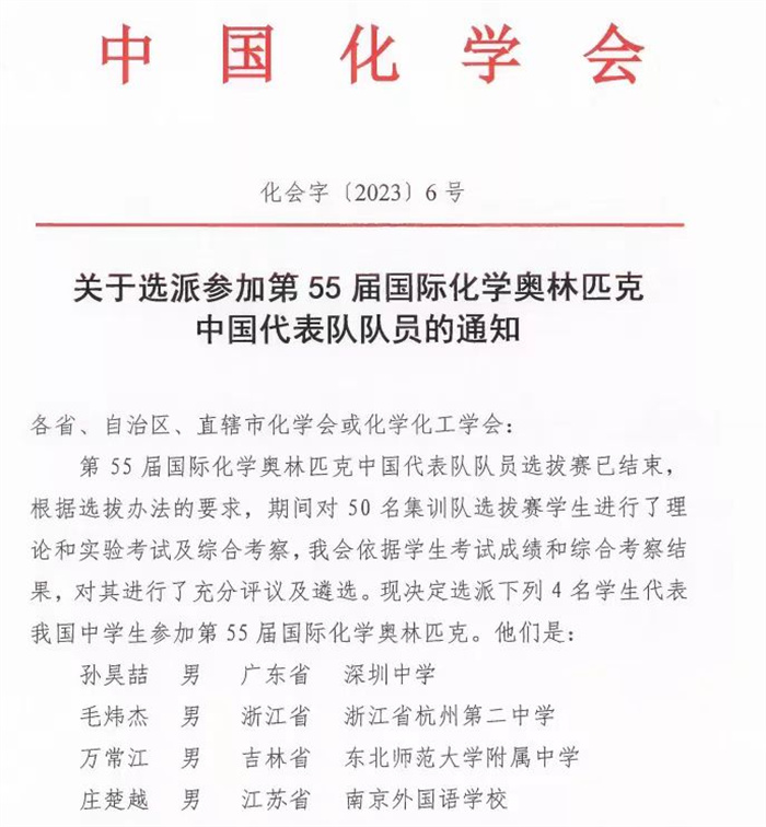 第55届国际化学奥林匹克中国代表队队员选拔赛于2023年3月5日至3月17日进行,东北师大附中夏天明、万常江、王博、彭馨乐同学参加了选拔(在第36届中国化学奥林匹克决赛中4名同学分别以全国第1名、第10名、第27名和第36名的优异成绩入选国家集训队)。