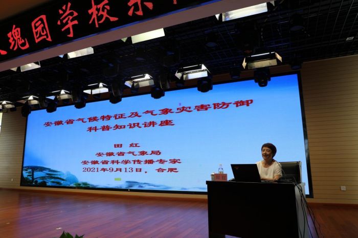 (2021年9月13日,安徽省气候中心总工程师田红,在东校区进行气象科普知识进校园活动讲座)