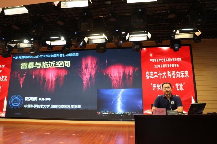 (2022年9月20日,中国科学技术大学地球和空间科学学院陆高鹏教授在东校区进行气象科普知识进校园活动讲座)