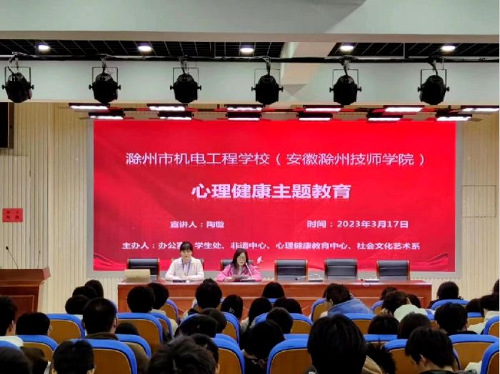 为深入了解和广泛践行社会主义核心价值观,进一步加强学生心理健康教育,维护学生生命安全,促进学生身心健康发展,3月17日下午,滁州市机电工程学校(安徽滁州技师学院)“知家乡 爱故土 懂文化 传文明”系列教育活动携手校心理健康教育中心,在土木楼三楼多功能会议室,组织开展了一场“你好生命”心理健康主题讲座,来自全校30多个专业近200名学生代表认真聆听了本次讲座。讲座由校心理健康中心主任、社会文化艺术系副书记陶璇主讲,校非遗中心主任、社会文化艺术系副主任陈海珍主持。