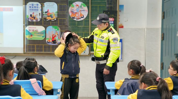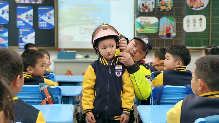 同时,杨警官重点强调了“一盔一带”的重要性,邀请同学们演示如何正确佩戴安全头盔,叮嘱同学们过马路要走斑马线、不乘坐超员车等注意事项,自觉遵守交通法律法规,提高自我保护能力。同时,他鼓励孩子们通过“小手拉大手”的方式积极向家长和身边的人传播交通安全知识,共做文明守法的交通参与者。