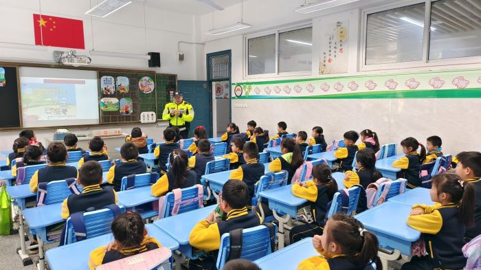 活动中,铁骑杨警官紧紧围绕“知危险 会避险 促文明”交通安全主题,运用通俗易懂的语言和生动的图片,为同学们详细介绍了日常接触的道路、车辆、交通信号、标志标线的含义,并结合学校周边的复杂交通环境,告诉同学们如何安全过马路、安全乘车等安全常识。