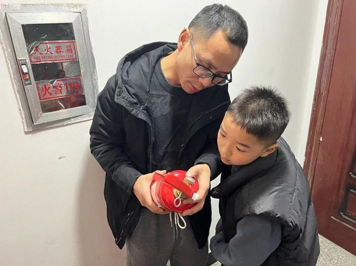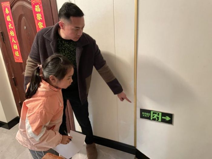 孩子和家长一起开展家庭消防隐患排查,查看了家用电线是否存在裸露老化现象、消防通道是否通畅、是否存在超负荷用电、电动自行车禁止“进楼入户”违规停放充电、取暖设备或烘烤衣物时是否存在外物覆盖、灭火器是否过期等。