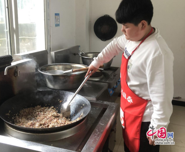 野葱是孩子们翻山越坡采挖的,竹笋是新鲜当季的,腊肉是师生们自愿从家里带来的,所有食材在几双妙手下井然有序地被切成片、丝、丁、末。再经过大厨的煎煮烹炒,腊肉的咸,竹笋的鲜,野葱的香,相互渗透融合,让人垂涎欲滴的纯天然美味馅料大功告成。