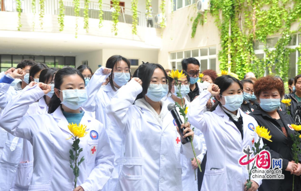 “健康所系,性命相托”,现场25名身穿白大褂的医学生举起右手,紧握双拳,重温了《医学生誓言》,他们铿锵有力的宣誓,彰显出该校医学生成为医者的初心和使命。