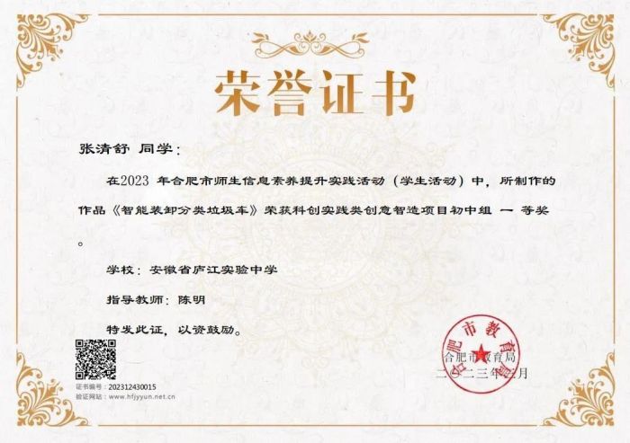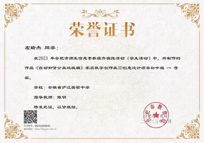 近日,合肥市2023年中小学生信息素养提升实践活动传来好消息,庐江实验中学四位同学榜上有名,左瑜杰同学获得3D创意比赛一等奖,李沁君同学获二等奖;张清舒同学获创意智造比赛一等奖、徐泽威获二等奖。