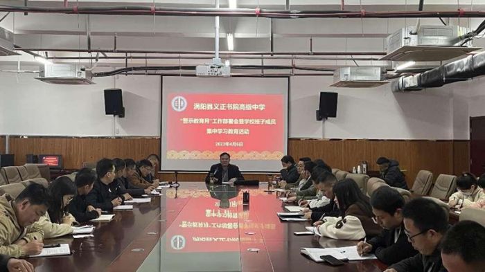 4月6日,涡阳县义正书院高级中学“警示教育月”工作部署会暨全校班子成员集中学习教育活动在行政楼四楼会议室举行。校长尹新与其余班子成员参加会议,会议由副校长梁福海主持。