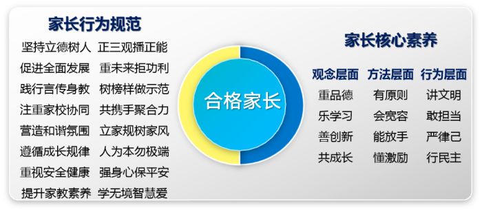 在课题研究中,青羊区在全国率先提炼出家长的 “三元核心素养”(方法层面:有原则、会宽容、懂激励、能放手;行为层面:敢担当、讲文明、行民主、严律己;爱好层面:会学习、乐创新、喜阅读、爱运动),引领家长提升育子水平。之后,青羊又提出了“青羊家长行为规范”(坚持立德树人,正三观,播能量。促进全面发展,重未来,拒功利。注意家校配合,共携手,聚合力。遵循成长规律,人为本,勿极端。营造和谐氛围,立家规,谱家风。提升家教素养,学无境,智慧爱。重视安全健康,健身心,保平安。践行言传身教,树榜样,做示范。)帮助青羊家长规范自身行为。