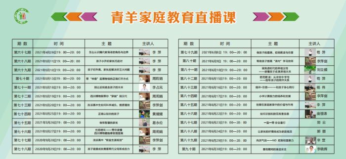 为应对突发公共卫生事件,在青羊区家庭教育基地开设了“青羊家庭教育直播课堂”,每周三次直播课提供给家长的都是系列课程,比如亲子沟通系列、安全教育系列、劳动教育系列、近视防控系列、家庭关爱系列、期末复习建议系列等,系列课程培训更有效地指导家长掌握家庭教育科学理念及方法,到目前为止,直播120余场,有近60万人收看。