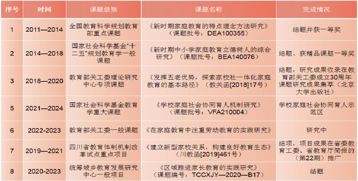 为提升青羊家庭教育的品质,青羊区以科研为引领,深入开展家庭教育理论研究,实现家庭教育科学化。先后承担完成国家级课题《区域推进家庭教育的实践研究》、《探索家-校-社一体化家庭教育路径的研究》、《学校家庭社会协同育人机制研究》。省级课题《建立新型家校关系构建良好教育新生态》、《区域推进家长教育的实践研究》。市级课题《新冠肺炎疫情背景下家校共育的应对策略》。