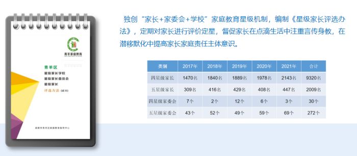 青羊区从2016年实施全域推进家庭教育的实践以来,创新实施“全域家庭教育供给侧结构性改革”,将家庭教育纳入民生重点工程强力推进,构架“政府主导、部门联动、教育统筹、社会参与、家庭主体、媒体服务”的家庭教育指导服务新格局。开创了“两纳入一走进”全域统筹推进家庭教育新模式,即把家庭教育纳入社会公共服务体系,纳入学校办学绩效考核评估体系,覆盖全区中小学、幼儿园及社区。