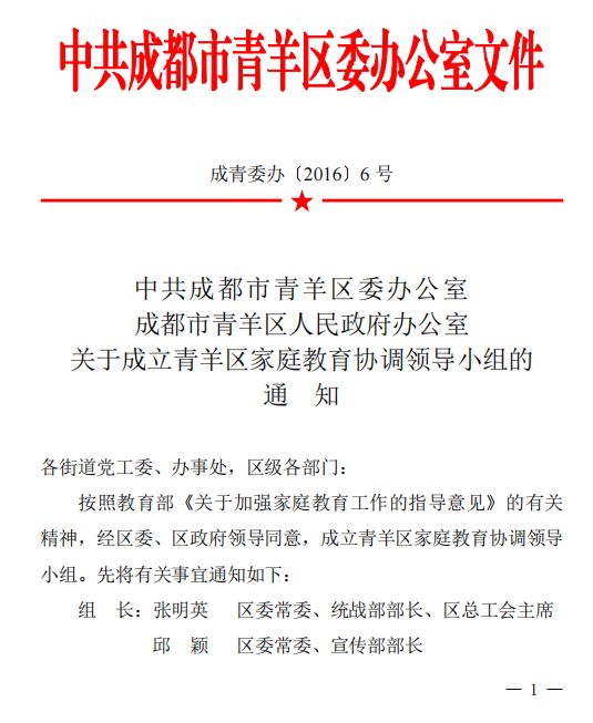 2016年3月,成立“青羊区家庭教育协调领导小组”,成员由区文明办、区妇联、区教育局、区民政局、区卫健局、团区委、区关工委等七大部门组成,由分管区领导亲自担任组长,在协调领导小组的统筹领导下,出台了《青羊区关于加强家庭教育工作的实施方案》。青羊区成立了家庭教育指导中心作为家庭教育工作的运行平台,指导中心主任由青羊区教育局分管家庭教育的副局长担任,设常务副主任一名,负责全区家庭教育日常工作。健全的组织机制确保家庭教育工作落实、落地、落细。