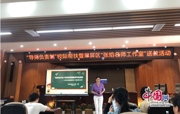 中国网讯 为落实“双减”政策,提高小学英语教师的专业能力,打造高效课堂,加强区县教师之间的交流和沟通。4月13日,四川省王丽君名师鼎兴工作室宜宾张焰工作站主持人张焰率工作室部分成员到宜宾市中山街小学屏山学校开展小学英语送教研讨活动。屏山县教育和体育局副局长甘小兰、师训中心英语教研员王珍老师以及小学英语第四片区联组学校部分英语老师到场观摩、研讨。