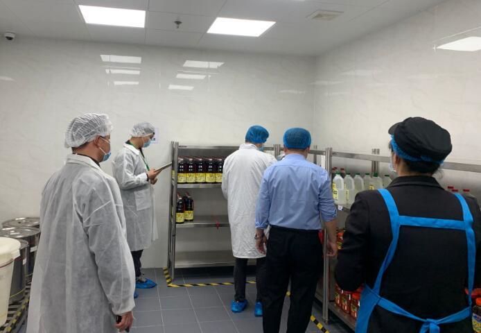 检查小组首先查看了食堂整体的环境卫生、员工的健康证、主副食仓库食品的储存规范、冷库的食品摆放、原材料的品质及加工制作过程、食品的留样、餐用具的消毒等,并对主副食、调味品进行现场取样、密封,整个过程严谨规范。