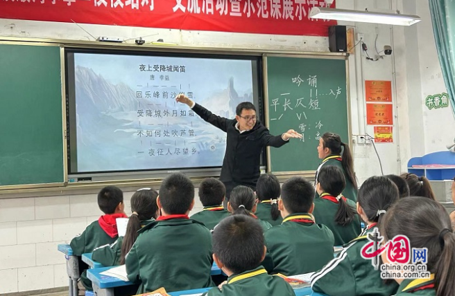 翠屏区语文骨干教师黄平给孩子们带去了一堂精彩的古诗吟诵课《夜上受降城闻笛》。黄平像叙家常一样,联系关键词从古诗的时代背景讲起,带着孩子们感受诗句描写的场景,教给孩子们学会“平长仄短”的吟诵方法。在黄平抑扬顿挫的吟诵声里,孩子们仿佛感受到了边塞古城的荒凉和征人的思乡之情。带着感受,孩子们用黄平老师教的方法,声情并茂、手舞足蹈学习吟诵,很快入情入景。