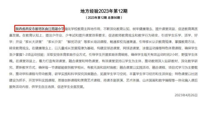 近日,西安市曲江南湖小学(以下简称“曲江南湖小学”)典型经验被教育部全国中小学管理服务平台地方经验2023年第12期采纳并进行全国推广。