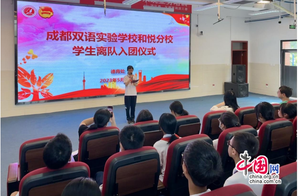 中国网6月5日讯(王李科)“十四而志,铸梦青春。”为进一步引导广大青少年厚植爱党、爱国、爱社会主义的情感,切实增强团员先进性和光荣感,引领青少年迈好“青春第一步”。近日,成都双语实验学校和悦分校初中部举行了“告别红领巾,青春驶向团”活动。该校八年级全体少先队员齐聚学术厅,参加了隆重热烈、意义非凡的离队入团仪式。同时,本学期“和悦”团支部迎来了新加入的六名共青团员。