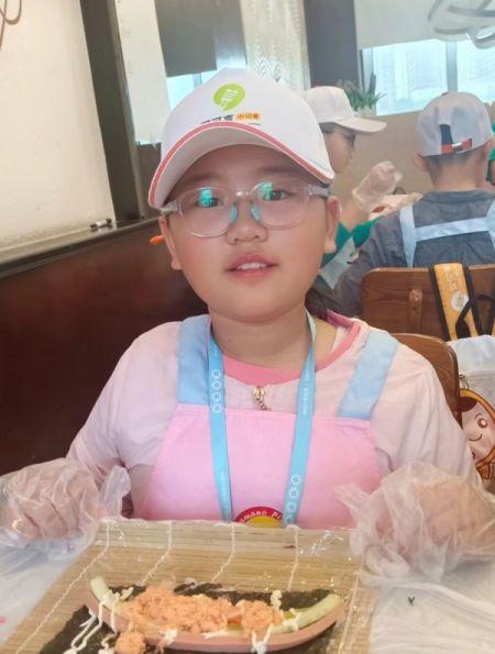 做完寿司后,服务员们给我们发了一个装寿司的盒子,还帮我们切了寿司。看着自己亲手做成的寿司,我的心里美滋滋的!