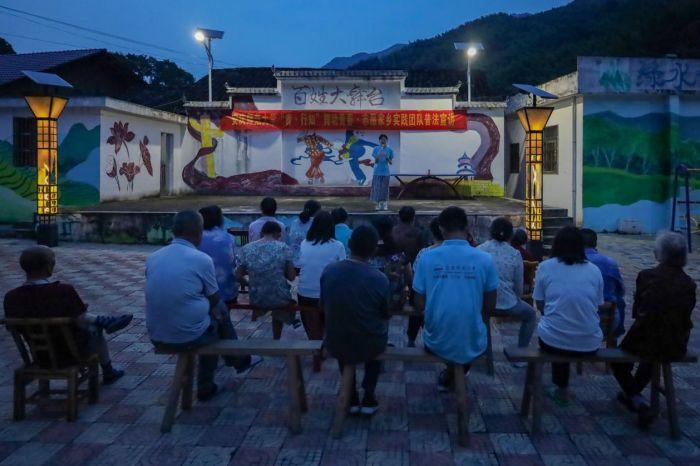 新文艺深入邻里坊间,新风尚步入大街小巷。在安庆市太湖县西冲村,体育学院“舞动青春,志愿家乡”暑期三下乡实践团采用小剧场的形式普及法律大知识。“普法小剧场结合乡村实情力求做到浅显易懂,将理论知识具象化,有利于村民的理解,帮助他们扫除法律盲区。”体育教育专业2021(1)班的朱继浩表示。普法之余,实践团成员发挥专业技能,成为当地居民跳广场舞的“每日舞伴”,动感的音乐、专业的舞姿和热闹的氛围吸引了不少村民加入其中。学生们选择“接地气”的方式,以群众喜闻乐见的形式传播新时代好声音。