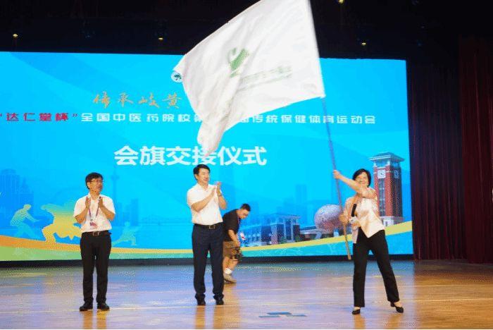闭幕式会旗交接仪式上,天津中医药大学党委副书记李鑫将“传运会”永久会旗交接给国家中医药管理局人事教育司司长陆建伟,陆建伟司长将“传运会”永久会旗交接给第十六届“传运会”承办单位安徽中医药大学副校长戴敏。(文图/温健伟)