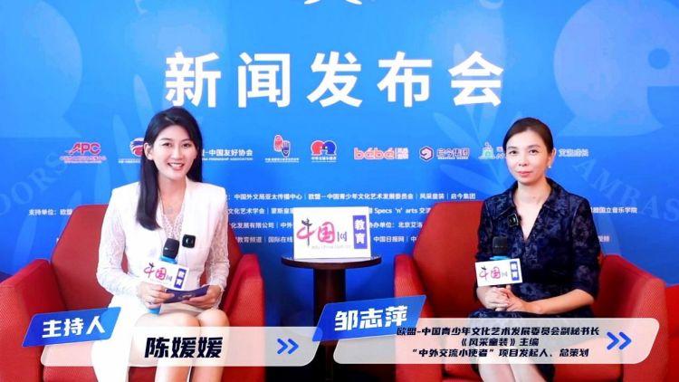 主持人:中国网的各位朋友,大家好!这里是“中外交流小使者”活动现场。坐在我旁边的是欧盟-中国青少年文化艺术发展委员会副秘书长、《风采童装》杂志主编、“中外交流小使者”项目发起人、总策划邹志萍老师。邹老师,您好!欢迎参加本次活动。请您跟大家分享一下,欧盟-中国青少年文化艺术发展委员会为什么会策划“中外交流小使者”活动呢?