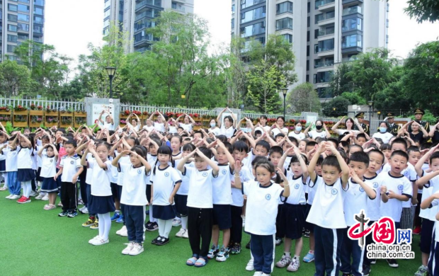 此外,幼儿园还邀请到武侯区退役军人战旗红“红色传承”志愿服务队,为大家带来了战术演练,他们动作整齐划一,吸引了孩子们崇拜的目光。军人叔叔还和幼儿们一起表演了手势舞《国家》,感受中华民族不屈不挠的精神。