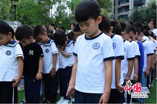 在园所升旗仪式结束后,天府二幼全体师幼为牺牲的烈士和同胞们默哀一分钟。这是刻在中华民族心口上的一道伤疤,只有自强,才能自救。