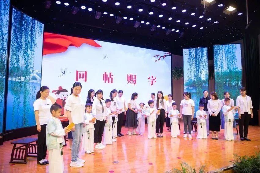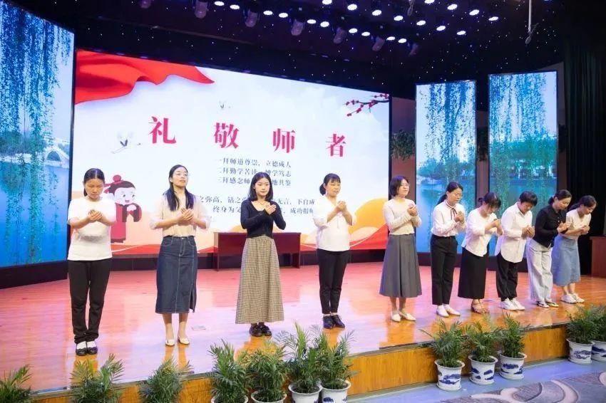 仪式第二项,行礼拜师。伴随着庄重典雅的古乐,全体新生正立己位,整齐地伸出双臂、拱手、弯腰、作揖,向师长行三拜高揖礼。全场弥漫着师生间神圣浓厚的礼敬之意。随后家长代表携孩子宣读拜师帖,新生呈拜师帖。薄薄一纸“拜师帖”,浓浓满载师徒情。