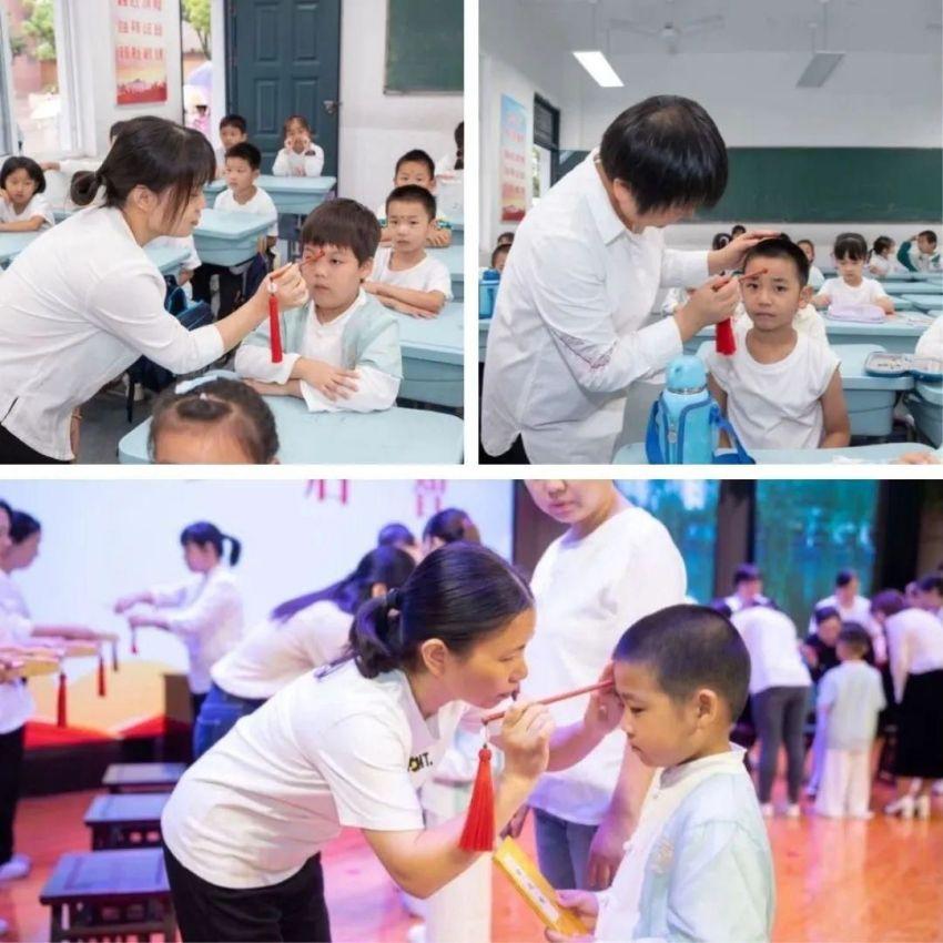仪式第四项,朱砂启智。老师们用毛笔在孩子额头正中点上红痣,所谓“一点朱砂入心房,心明眼亮开吉祥;妙笔诗书传家久,状元及第花满堂。”祝愿孩子们从此开启智慧,眼明心亮,用功读书,奋发向上!