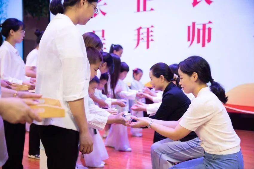 仪式第三项,新生敬茶。茶为师,谦和恭敬,德馨兼备,学古至今。孩子们为我们可敬可爱的老师敬茶,感恩老师的爱心呵护,感恩老师的细心培植,感恩老师的精心教育,感恩老师的无私奉献。