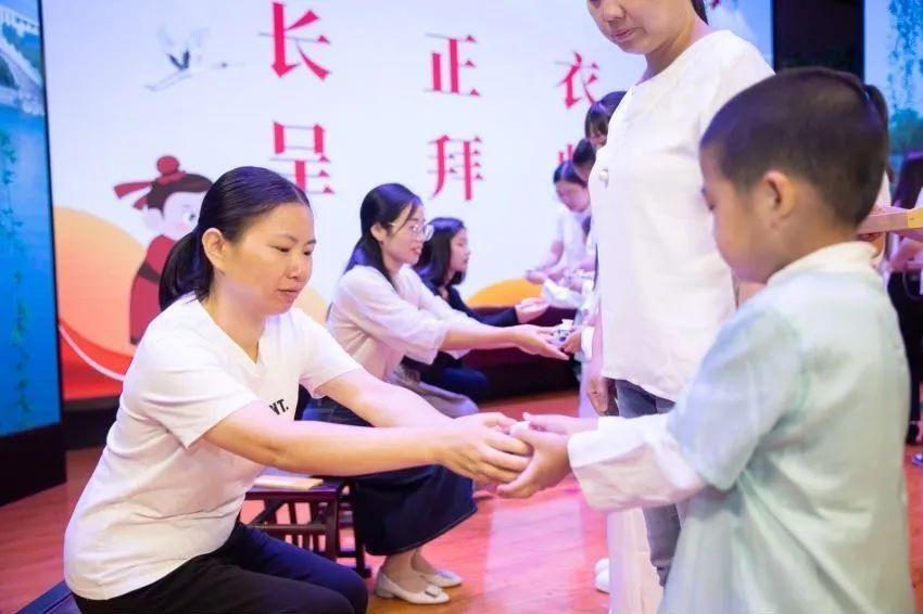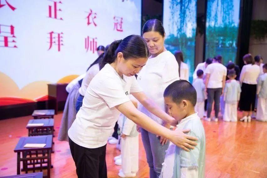 拜师礼上,仪式满满,场面温馨感人。仪式第一项,正衣冠。古人云:冠必正,纽必结,衣贵洁,不贵华。所谓读书学习,始于衣冠;先正衣冠,后明事理。孩子们穿戴整齐、洁净,更能展现着良好的精神面貌。