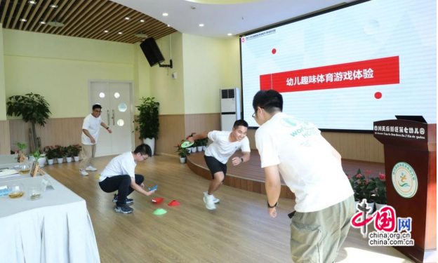 天府七幼胡俊杰老师以“幼儿园体育活动内容”为主题带领老师们熟悉了体育政策纲领文件、幼儿健康的内涵,也理清了幼儿园体育活动的总目标、类型内容等相关知识要点。理论学习后,老师们一起参与幼儿趣味体育游戏体验活动,以理论与实践相结合的方式,了解了多样化的体育游戏能有效增强幼儿参与体育活动的积极性,以及对幼儿多领域融合发展具有重要意义。