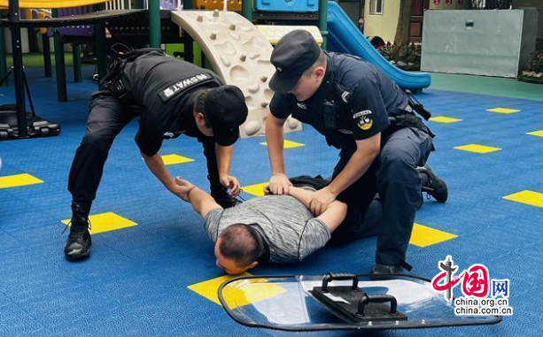 演练开始:危险——幼儿园关门之际,“歹徒”欲闯入园内,被安保人员询问阻拦。紧张——“歹徒”手持利刃想强行闯入,保安见状迅速做出反应,第一时间摁下“一键报警”设备,拿起防暴盾牌、钢叉上前阻止,与“歹徒”周旋。保护——班级教师听到警报信号,立即停止一切户外活动,同时迅速组织幼儿快速、有序地疏散到就近室内躲避,教师及生活老师锁门、关窗,以重物挡住门口,做好全面防护。搏斗——两位保安以及行政人员一起与“歹徒”周旋,为警察的到来争取时间。很快,特巡警赶到制服了“歹徒”。