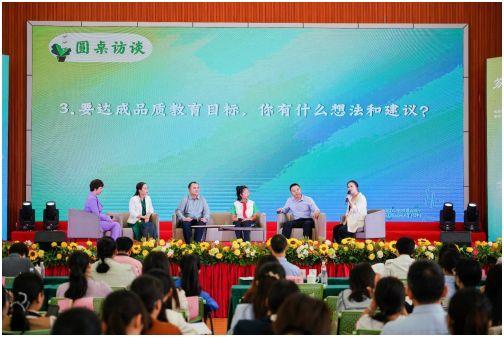 项目总结会在芬芳报告厅拉开序幕。通过一则短片,大家一起回顾了北京师范大学教育培训中心与南宁市兴桂路小学集团校共建的资源服务项目历程;北京师范大学教育培训中心项目负责人柴静老师做了项目总结汇报;唐玲校长有感而发,与大家叙说了“芬芳家的故事”,细数兴桂师生成长的点点滴滴。“圆桌访谈”环节将本次会议推向高潮。本次访谈的主题为“重品质教育,促协同发展”,校长唐玲、教师代表刘海、家长代表覃学文、学生代表韦安慧和北京师范大学教育培训中心曹周杨老师一起,围绕“你心目中的品质教育”“为了达成品质教育,你有什么想法和建议”等问题,分别从不同角度各抒已见,畅谈品质教育的未来。最后,总结会在兴桂路小学集团校“小桂花合唱团”带来的南宁市合唱金奖曲目《校园里的蔷薇花》中圆满落幕。