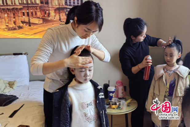 比赛当天,老师和孩子们一大早来到现场做准备。化妆、梳头、换服装,从发型发饰到鞋袜整理,都争取尽善尽美,为孩子们赛场的表现增光添彩。