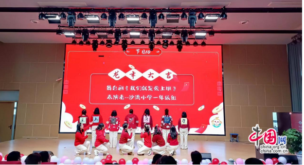 沙湾小学二年级组老师们的舞台秀《最炫民族风》,用舞姿展示潮流元素,用步伐展现沙湾小学教师的风采。龚嘴学校诗朗诵《我爱上班》表达着过去的一年,老师们每天迎着朝阳而去,伴着星辰而归的辛勤。福禄镇中心校艺术组手绘的《龙腾四海贺新年》,带给大家龙年新春的美好祝愿。沙湾小学六年级组“男神天团F6”在学校里兢兢业业,生活中能歌善舞,是大家心目中的男神。他们紧跟时代潮流,为大家带来《三笑江湖》,震撼人心,全场观众为之欢呼雀跃。沙湾小学三年级组合唱《我喜欢》,他们用动听的歌喉唱遍了世间的美好,温馨而感动。福禄镇中心校张诗仁老师表演《还原魔方》,与时间竞赛,用速度和自信为大家上了一节生动的人生之课。沙湾小学任美玲老师独舞《如愿》,带大家领略了一个个感人故事,向先辈们表明了老师们“将爱你所爱的人间”的态度。沙湾小学四年级组的舞蹈串烧《龙飞凤舞》,老师们花棉袄和西装的组合,冲击心灵;红绿青蛙的服装,别具一格。老师们舞得开心,观众看得嗨皮。福禄镇中心校全体老师诗朗诵《我们的新时代》也激励大家奋进新征程。沙湾小学一年级组表演《我们就是爱上班》更彰显了对教育工作的一片赤诚之心。我爱上班,上班使我快乐。调侃中不乏对工作的热情,诙谐中满怀对生活的热爱。沙湾小学五年级组《甄嬛传》配音秀——《期末的爱与恨》演绎期末时的爱恨情仇,道尽老师们期末的辛酸苦辣。
