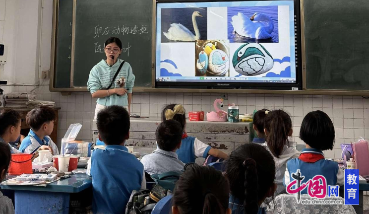来自关庙小学的胡欣怡老师带来了《卵石动物造型》课程展示。胡老师的教学思路清晰,教学重难点突出,通过层层递进的教学方式让学生很快明白了随型设计的定义,重点强调了如何在卵石上构图绘制小动物与色彩鲜艳等知识点,引导学生提高欣赏美和创造美的能力。