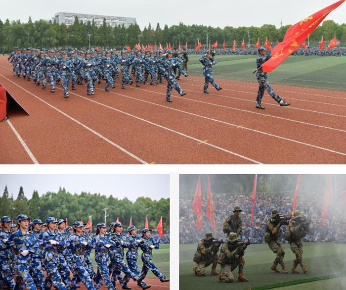 在军训总结汇报环节,各营新生代表组成的8个方阵,身穿戎装、英姿飒爽,迈着整齐的步伐,喊着铿锵有力的口号,依次走过主席台接受检阅。军训带训教官进行了刺杀动作、战术基础动作展示等,赢得了现场观众的阵阵掌声。