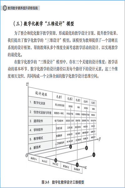 《教师数字素养提升研修指南》严格遵循教育部颁布的《教师数字素养》教育行业标准,系统呈现了教师数字素养的框架和内容体系,突出了“数字化应用”这一提升教学效果的关键板块,重点阐述了数字技术在教学设计、教学实施、学业评价和协同育人等方面的应用方法和实施策略。例如,在阐述数字化教学设计时,除详细介绍了数字化教学设计的基本途径外,还提出了数字化教学“三维设计”模型,指导教师如何在数字环境下更加高效地进行教学设计,将技术与学科教学很好地融合。