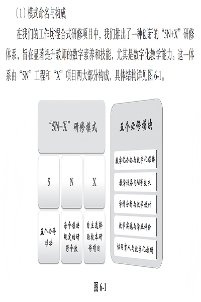 此外,第六章《教师数字素养提升研修项目实施指南》提出的基于工作坊研修的“5N+X”模式、基于学校三年研修规划的“6N+X”模式能为研修项目提供了切实可行的研修路径与操作体系,达成教师批量掌握数字化教学基本技能的目标。