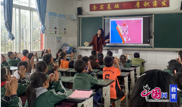 24日一早,在乐山师范学院继续教育学院熊明均院长的带领下,老师们来到了洛俄依甘乡小学校继续开展送教活动。彭娟老师带来的歌曲《这是什么》,是一首曲调活泼欢快的歌曲,彭老师以谜语的形式导入课题,孩子们兴趣盎然,课堂立刻活跃了起来;在课堂中,孩子们跟着老师一起欢快地歌唱和舞蹈;鲜明的节奏,欢快的歌声,流露出孩子们内心最真挚的情感。