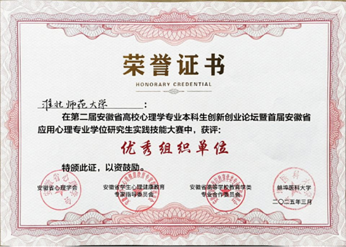 3月8日至9日,第二届安徽省高校心理学专业本科生创新创业论坛暨首届安徽省应用心理专业硕士实践技能大赛在蚌埠医科大学举行。淮北师范大学教育学院学子荣获一等奖2项、二等奖8项、三等奖2项,学校获“优秀组织单位”荣誉称号。