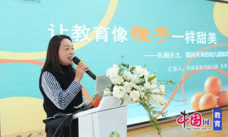 交流会上,井研县机关幼儿园以本土柑橘产业为依托,分享“橙文化”育人实践,通过党建品牌、主题课程等将乡土资源转化为教育载体;县幼儿园则介绍“榕文化”建设策略,从理念构建、环境营造到课程融合,形成可复制的文化育人路径。
