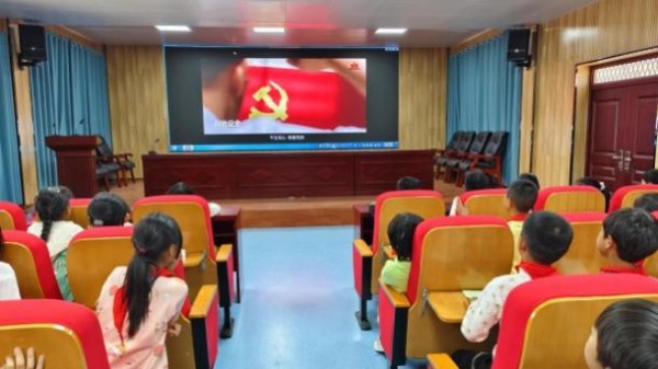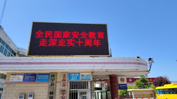 学校大门口电子显示屏显示宣传标语,渲染浓厚的宣教氛围。