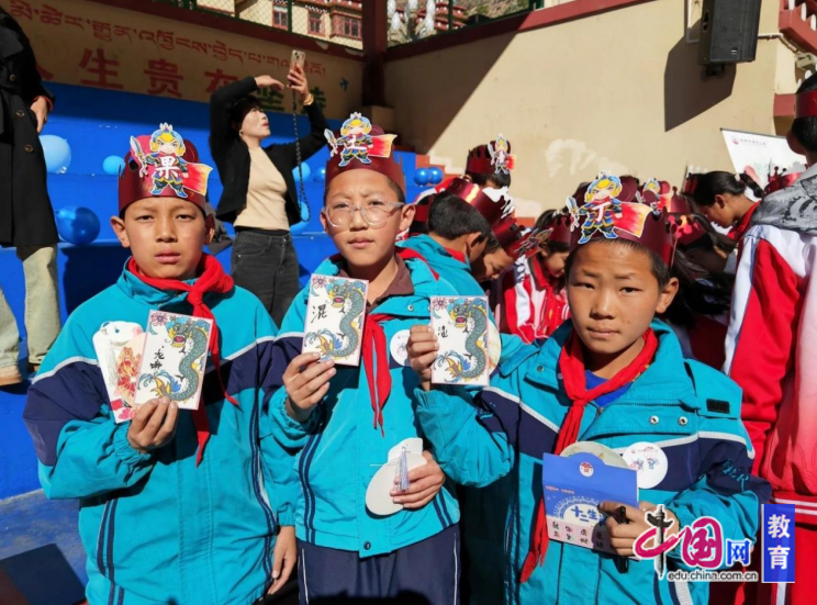 子课题组成员带去了康河学子精心绘制的十二生肖明信片、四季书签,以及传统文化气息浓郁的创意纸卡垫系列作品,还送上了康河教师团队倾心打造的中华优秀传统文化读本《人在天地间》《十二生肖》和《二十四节气》,以及配套的微课视频。这些资料和书籍可以为藏族学生学好汉语、了解中国文化提供更多的帮助。