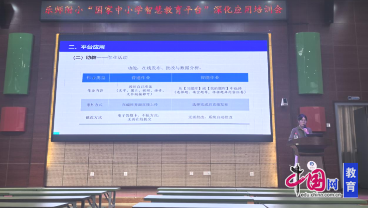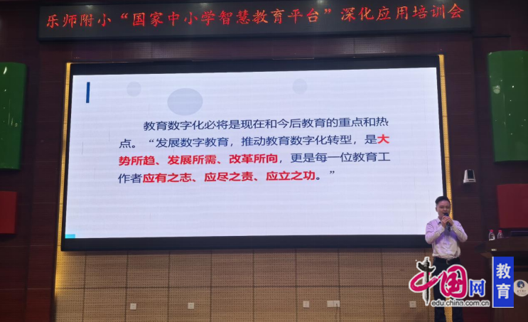 为全面推进教育数字化战略行动,深化国家中小学智慧教育平台应用实践,近日,市教育技术装备处专家陈欣、王宁受邀走进乐山师范学校附属小学,为全体教师开展专题培训。活动聚焦平台功能解析与实践路径,通过理论讲解与案例剖析,为学校教育教学创新注入新动能。