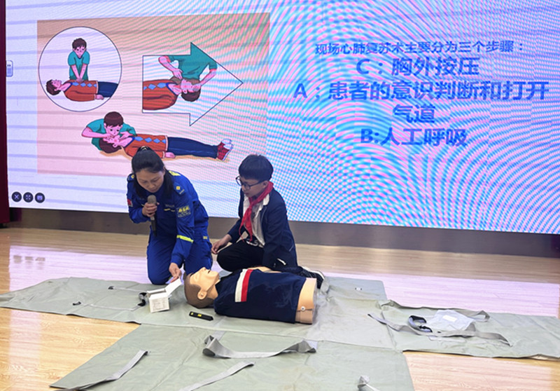 随后,利用竹竿、漂浮物等工具演示科学施救的方法,纠正“手拉手救人”等错误行为,并现场教授心肺复苏术(CPR)操作流程,指导学生进行模拟演练。设置趣味问答环节,学生积极参与,在轻松氛围中巩固防溺水知识。